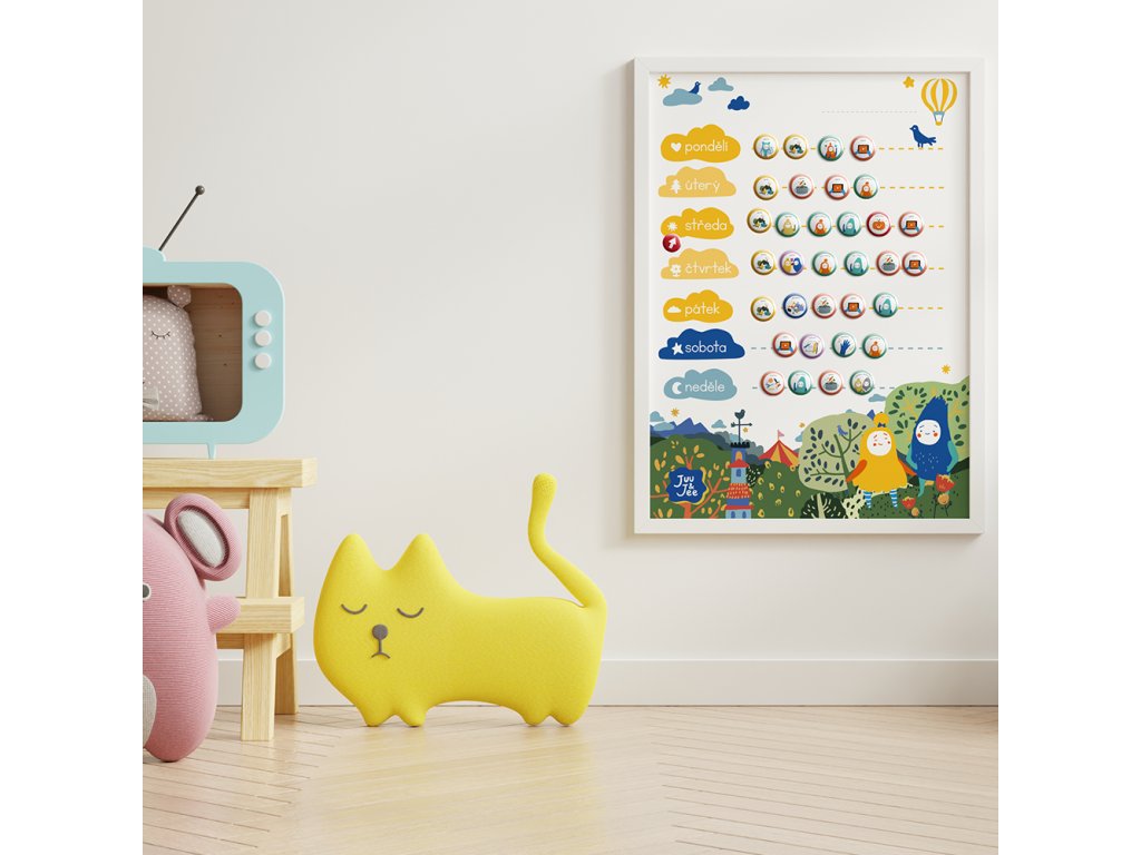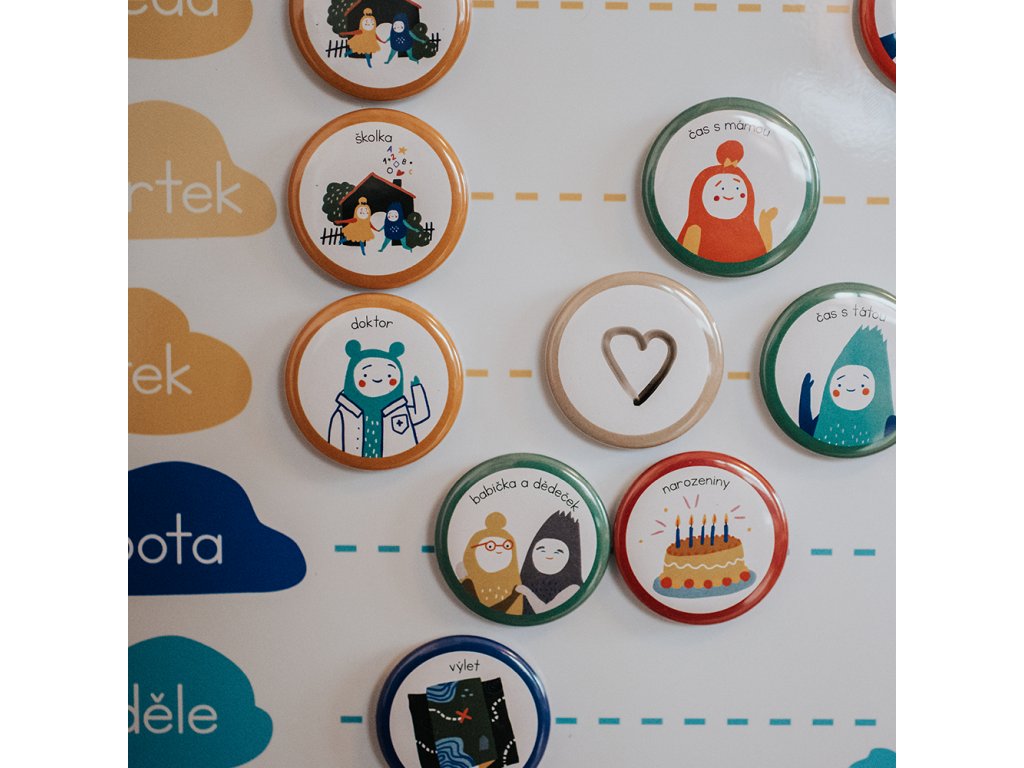 - 20 magnetek: 5x magnet školka, čas s maminkou, čas s tatínkem, babička a dědeček, čtení knížek, tablet, tvoření, uklízení, svátek, narozeniny, doktor, návštěva, výlet, hernička a hřiště,